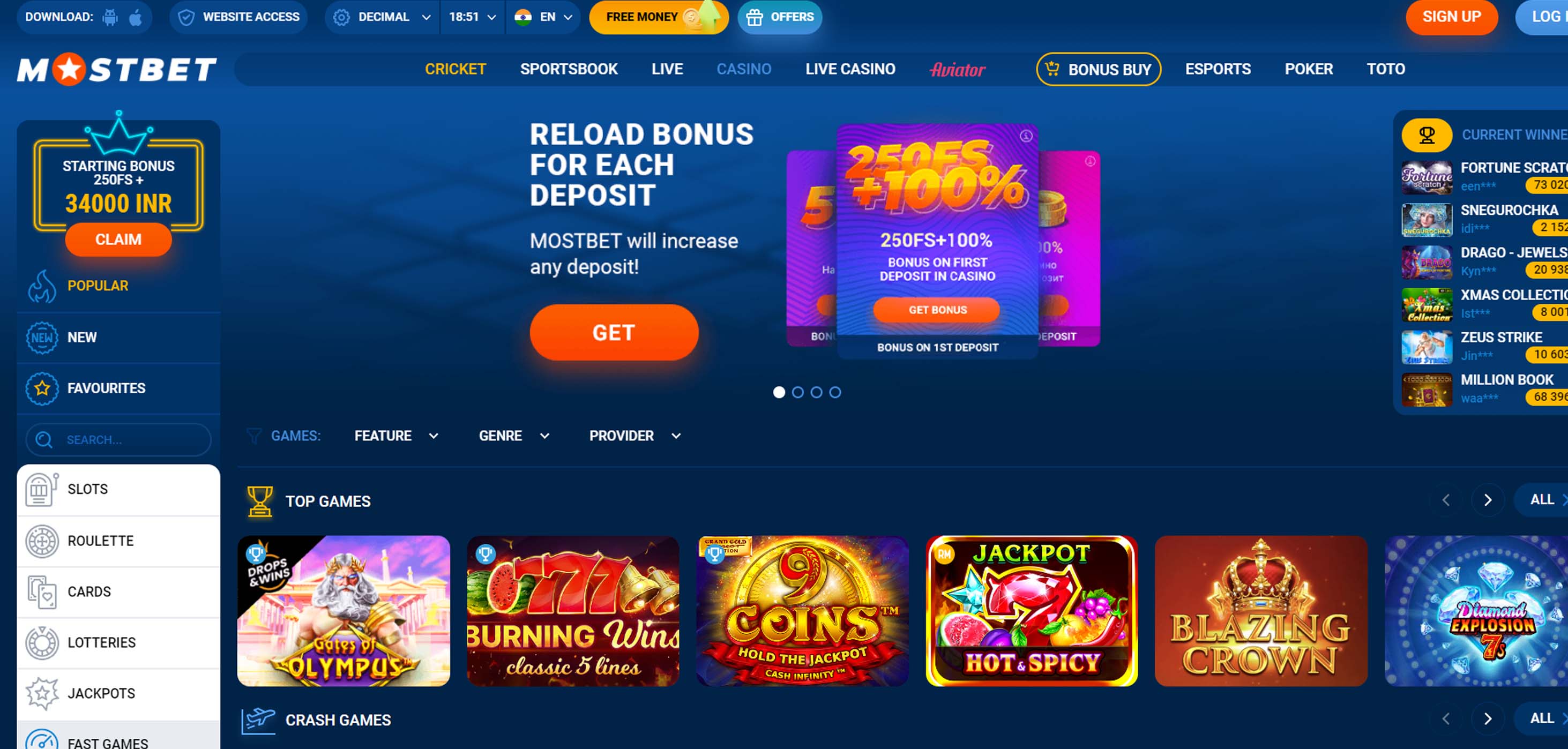 First Deposit Bonus 125% 34,000 INR + 250 Free Spins